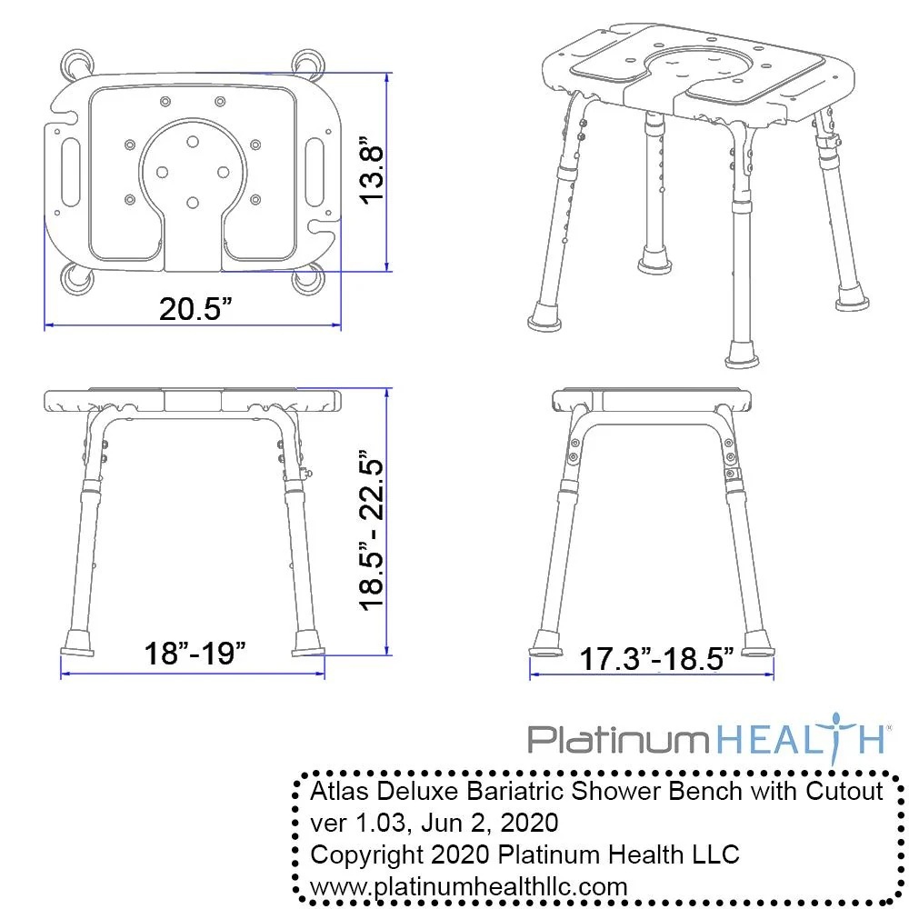 - EXTRA-LARGE SEAT SURFACE- A generous overall seat surface dimension of 20.5 x 13.5 inches is the LARGEST SEAT SURFACE AVAILABLE in this type of bench. Carefully compare to dimensions of competitive benches, what could be more important in a bariatric shower bench that an OVERSIZED SEAT? Seat surface also includes integrated shower wand holder for overall safety and convenience.
