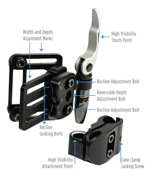- Patented Compass Hardware quickly installs to wheelchair and easily adjusts for depth, height, and angle while the user remains seated.