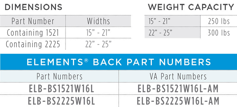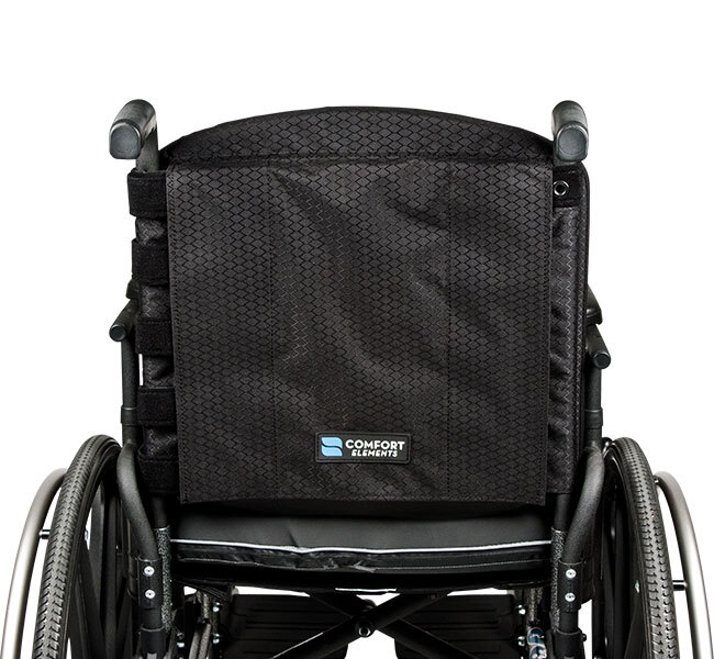 The Elements® Back is a general use back that easily folds with the wheelchair for easy transportation and storage. The adjustable tension strapping system allows the Elements® Back to accommodate for kyphosis and provide lumbar support.