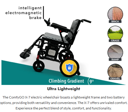Introducing the ComfyGO X-7, a revolutionary foldable electric wheelchair designed for the modern traveler. This lightweight and portable wheelchair is built with a high-quality aircraft grade alumiun allowy lightweight frame and powerful motors to ensure a comfortable and reliable experience.