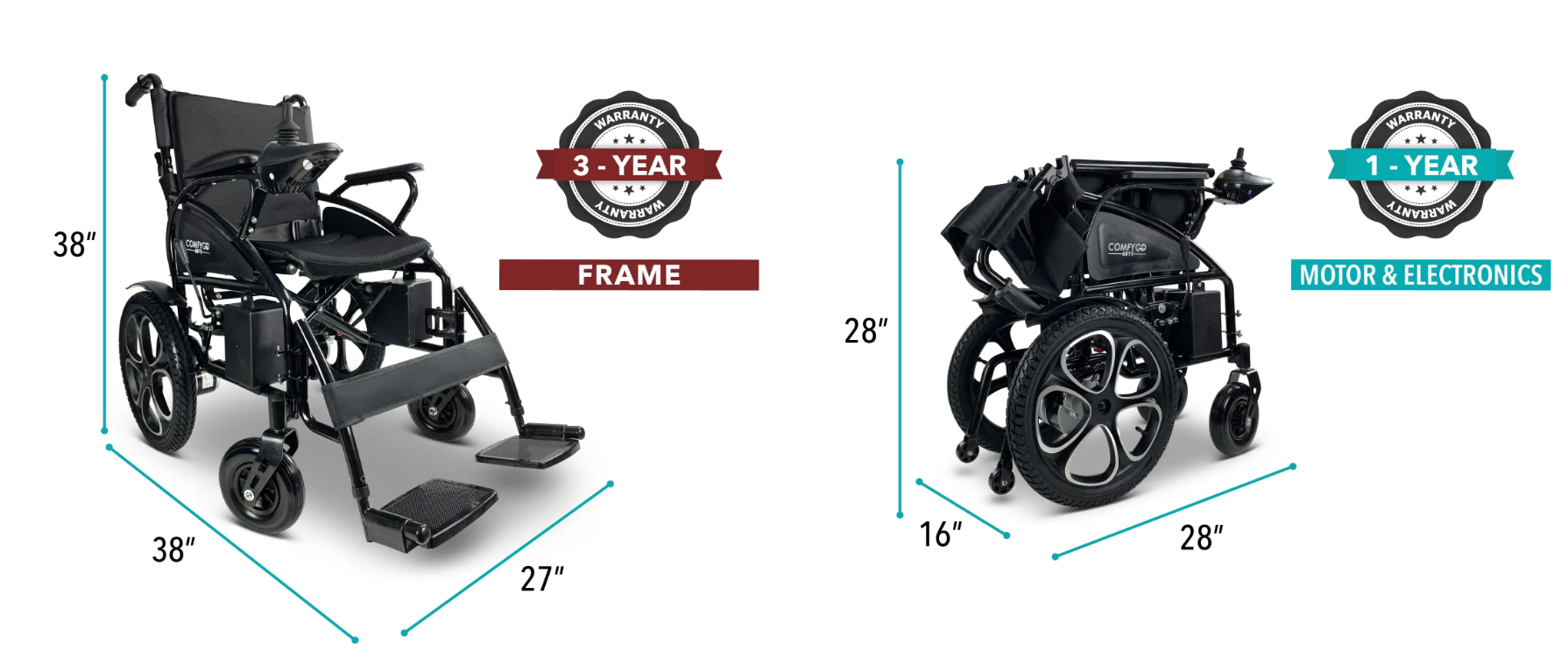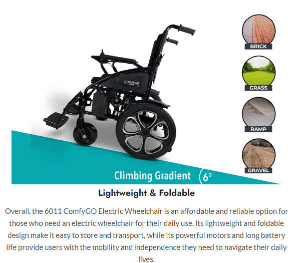 The 6011 ComfyGO Electric Wheelchair is an affordable and foldable electric wheelchair that offers convenience, portability, and maneuverability. Weighing just 67 lbs, it is one of the lightest electric wheelchairs available in the market, making it easy to transport and store. Despite its lightweight design, it has a weight capacity of up to 265 lbs, making it suitable for a wide range of users. The wheelchair is equipped with a 360-degree waterproof universal intelligent joystick that offers easy control and maneuverability. The joystick includes a power on/off button with a power indicator light, speed selection buttons, and a horn for added convenience and safety. ComfyGO 6011 can handle various terrains such as grass, ramps, brick, mud, snow, and bumpy roads, making it a versatile choice.