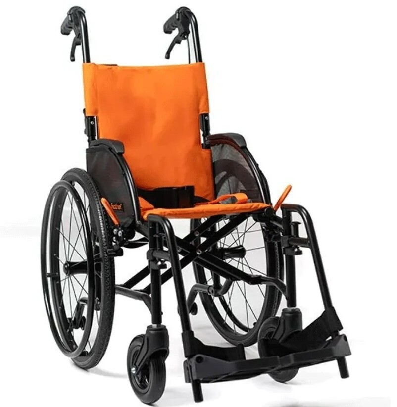 The Feather Kids Wheelchair comes in 12" (Orange) and 14" (Blue) wide seats and includes colorful washable nylon fabric and a seat belt.