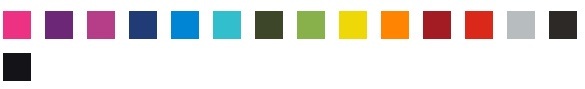 Bubble gum, Boysenberry Purple, Lush Lilac, Lollypop Blue, Sky Blue, Olive Green, Leaf Green, Daffodil Yellow, Tangerine Orange, Red Lollypop, Arctic Grey, Black Shimmer, Fine Texture Black