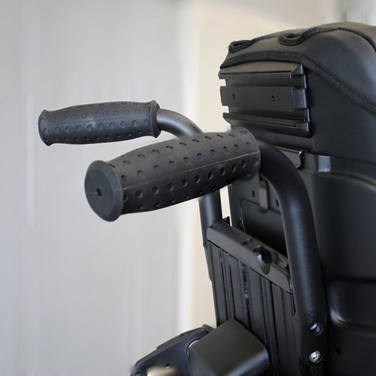 The Push Handles mount to the backrest hinge and allow the wheelchair to be pushed by a caregiver (to fine tune the position of wheelchair for vehicle transport, when the power source is depleted, etc.) For configurations with a low 20″ backrest, the push handles can provide a place to hook the elbow to provide pressure relief, stability and promote safe forward or lateral reach.