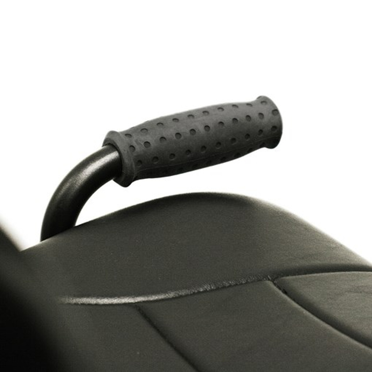 The transfer handles provide adjustable/removable supports for transferring into and out of the wheelchair and for weight shifts. They can be mounted anywhere along the UniTrack rail on the side of the seat and the height adjustable bracket helps to achieve proper positioning. The supports can also be rotated to face inward our outward for better access.