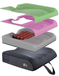 Precision Comfort AIR Cushion has a high-density, high-resilience foam base for long-lasting support. The air cushion's moisture-wicking, four-way stretch, and fluid-resistant cover keep the user dry and comfortable while allowing them to form into the air bladder. The Deep well allows for complete submersion of the IT and coccyx, providing excellent skin protection at vulnerable points while also preventing sacral sitting and promoting proper posture.