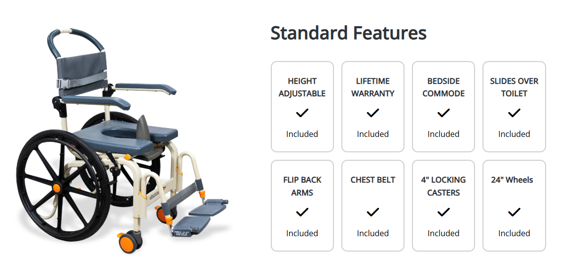 The Roll-InBuddy Solo (SB6W) shower chair is designed for use in a curbless/accessible or roll-in shower stall. The SB6W can roll over most toilets to be used as an over-toilet commode and can double as a bedside commode. It is a self-propelled shower chair and is designed for independent use. The SB6W includes two 24” large, self-propelled wheels that have hand brakes, to allow the user independent, safe, and easy maneuvering throughout their home and bathroom area. The chair is equipped standard with a front opening cushion, swing away and removable footrests, a clip-on calf strap, flip back armrests, a commode bucket with lid, urine guard, safety belt, and is height adjustable.