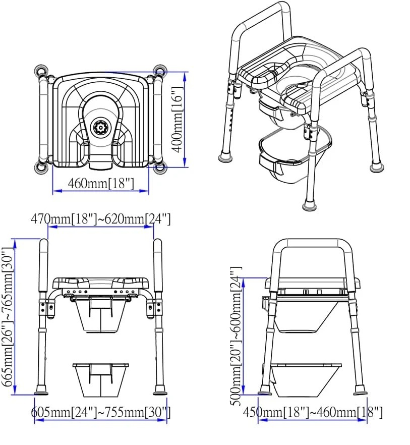 - MULTI-FUNCTION, 3 PRODUCTS IN 1 AND $60 VALUE IN FREE BONUSES!- Can be used as a raised toilet seat/bedside commode/shower chair. COMMODE PAIL AND LID INCLUDED for bedside use. OPEN BOTTOM FUNNEL INCLUDED- channels waste into toilet and prevents spills/leaks at higher seat settings. Commercial-grade polyurethane foam will never absorb water/medical-grade aluminum frame will never rust. All components are easy to clean/disinfect. BLUE PADDING WILL NOT STAIN/DISCOLOR LIKE OLD STYLE WHITE SEATS.